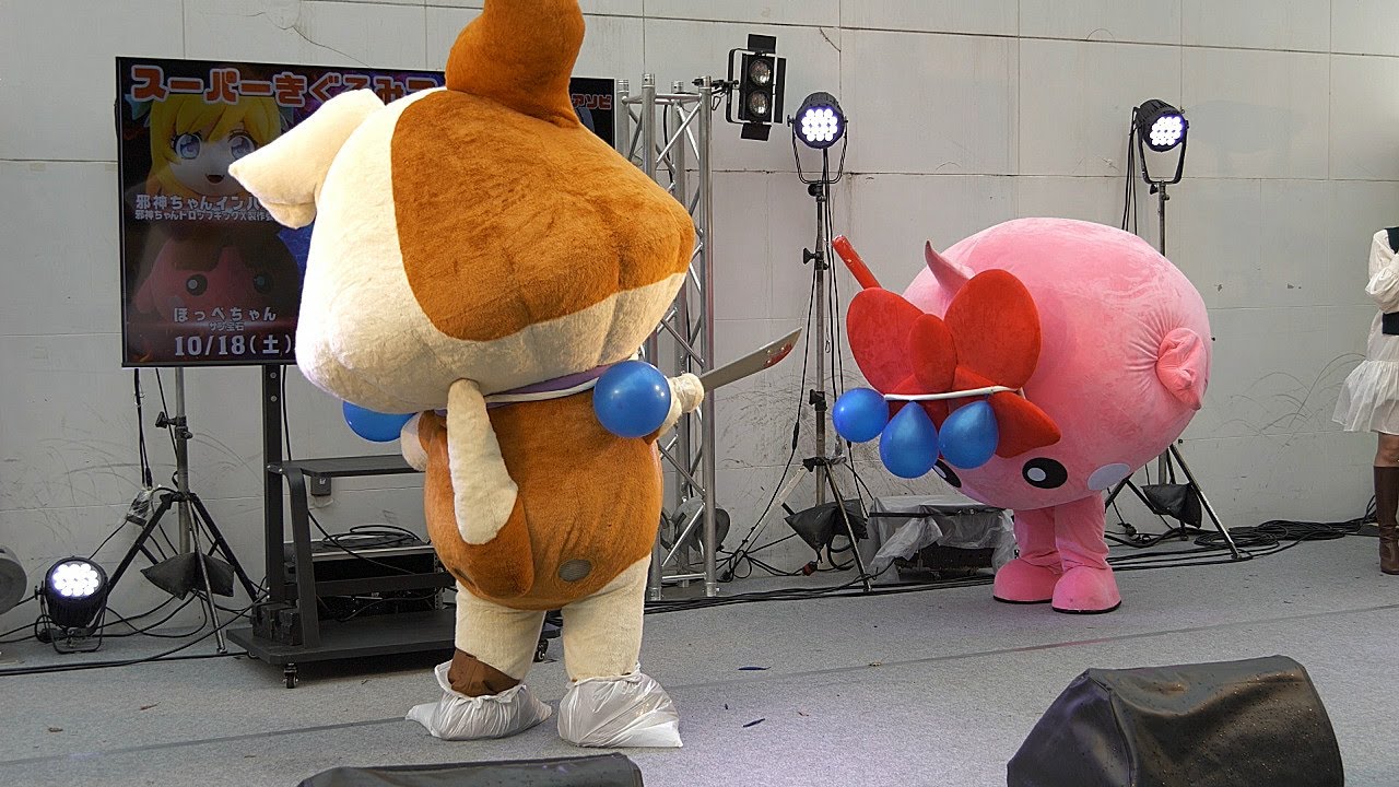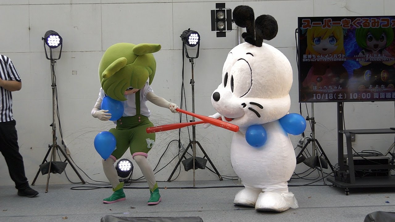 サン宝石のほっぺちゃん。スーパーきぐるみファイト!inマチアソビでは「きぐるみ同士が風船を割り合う」という形式のバトルが展開され、各キャラクターは画びょうのついた武器を装備しています。ほっぺちゃんは画びょうのついたバットを装備。なお、脚は「気合を入れたら生えてきた」とのこと。