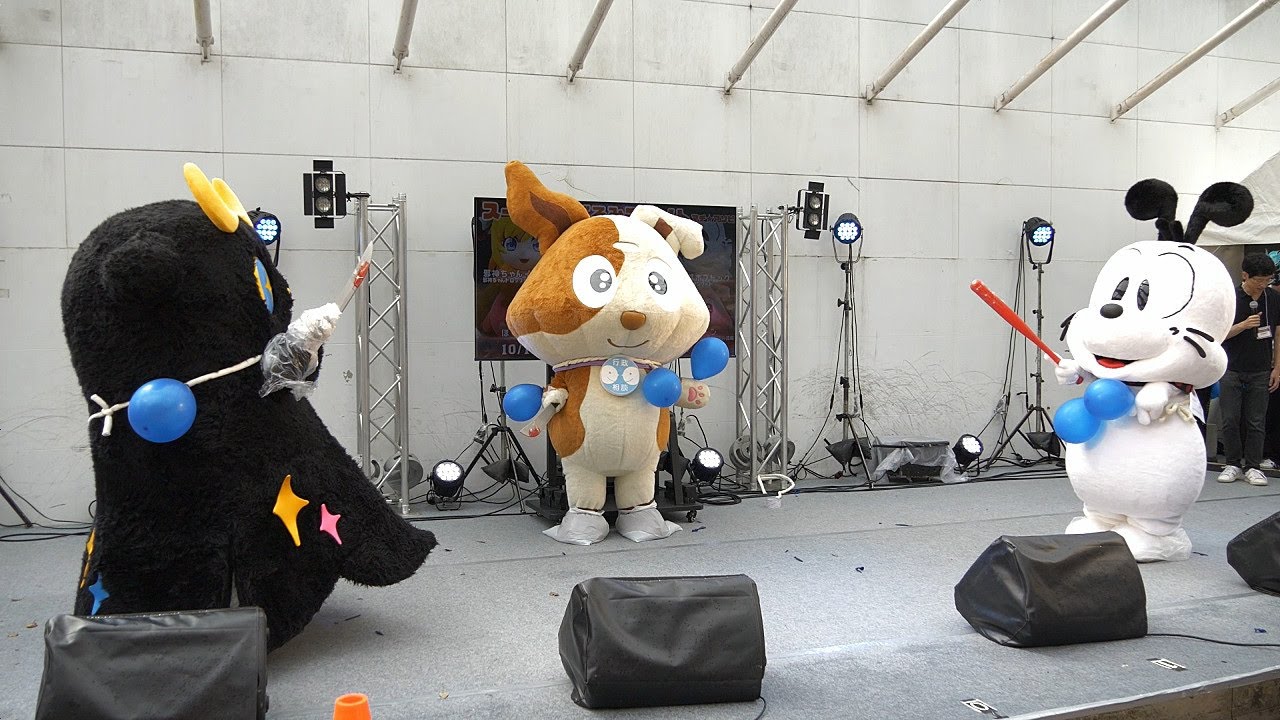 10時になってイベント開始。きぐるみたちが1体ずつ入場してきます。まず、リトルボブドッグがテチテチと歩いてきました。横にいるのは、同じサンワードが生み出した「家庭科のドラゴン」のマスクです。