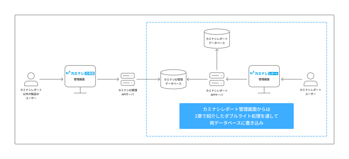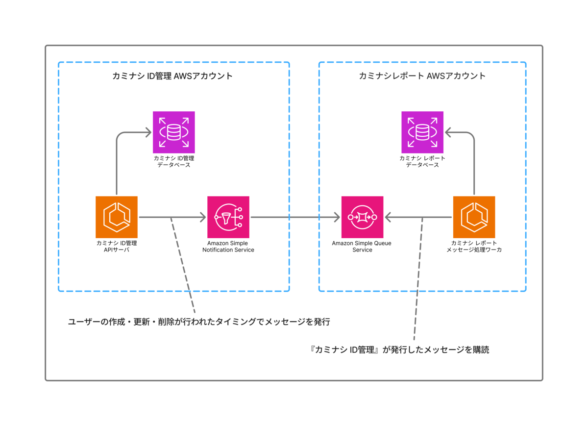 - 『カミナシ ID管理』側でユーザーが追加・編集・削除されたタイミングでメッセージを発行し、非同期で『カミナシ レポート』が持つユーザーデータを更新する
