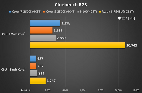 Ryzen 5 7545Uは、Multi CoreでCore i7-2600Kの約3.2倍、Core i5-2500Kの約4.2倍というスコア。コア数は2コアしか変わらないのにスコアの差は大きい。アーキテクチャの進化がよく分かるというものだ。