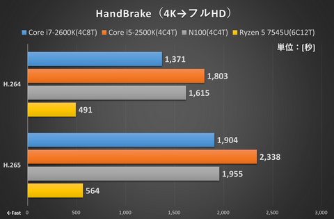 Cinebench R23で 全コアに負荷がかかるMulti Coreのテストで注目は、Core i5-2500KがN100に勝てないこと。1コアだけのSingle Coreのテストでは、Core i7-2600Kも負けている。 わずかTDP 6WのCPUがコア単体の性能ではSandy Bridgeを上回ると、時代の流れを強烈に感じる部分だ。