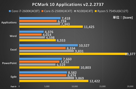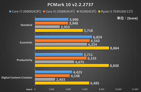 PCMark 10は、Web会議/Webブラウザ/アプリ起動のEssentials、表計算/文書作成のProductivity、写真や映像編集のDigital Content Creationで構成されるが、 ここではN100よりもSandy BridgeのCPUが上回った。アプリや処理によってはN100を上回れるということだろう。 その一方でRyzen 5 7545Uは、総合スコアのStandardがSandy Bridgeの約1.4倍と強さを見せている。