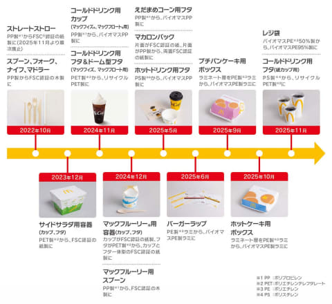 あわせて、5月に長崎県で先行導入していた、バイオマスプラスチック95%の持ち帰り用プラスチック製手さげ袋(レジ袋)を、全国のマクドナルドで順次導入する。先行導入では、耐久性や使用感が従来使用していたレジ袋(バイオマスプラスチック50%使用)と変わらないことが確認されている。
