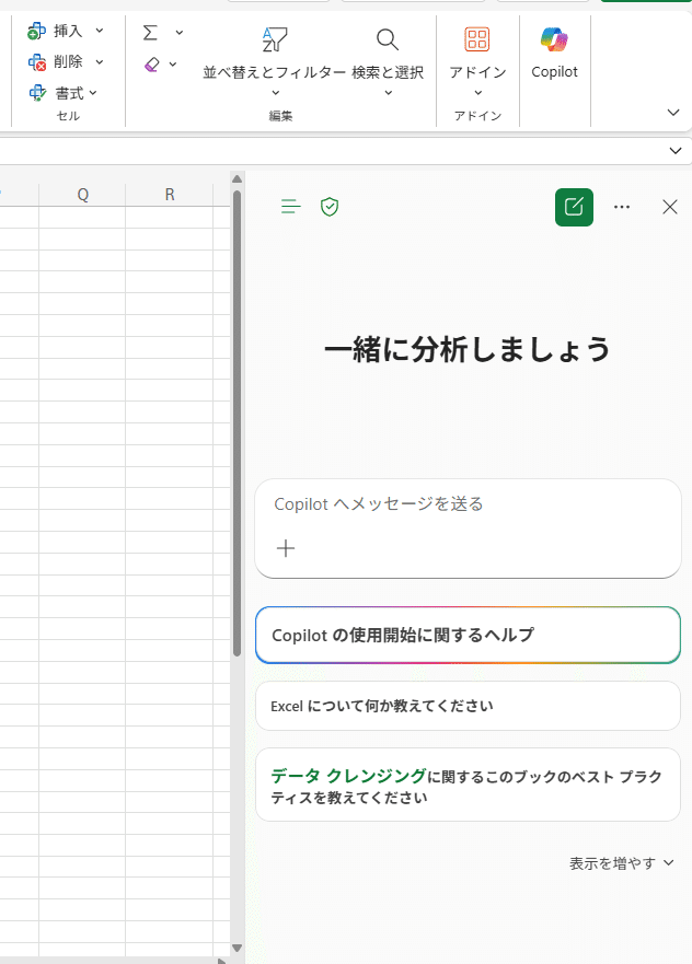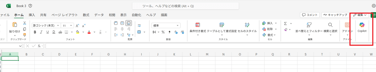 Microsoft 365からExcelを開き、Copilot があることを確認します。