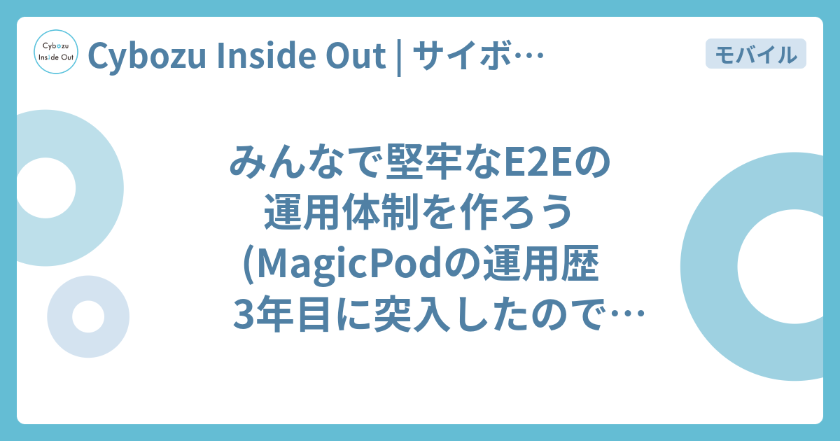 はじめに: MagicPod を使った、E2E の継続運用をふりかえって こんにちは。サイボウズ Office の iOS 製品 の QA の玉木( gkzz )です。 本記事では、E2E 自動テストの SaaS のひとつである MagicPod を使い始めてから3年目に突入したので運用の経験をご共有できればと思います。 特に以下のようなお悩みを抱えている方に向けて、本記事が一助となればうれしいです。 E2Eテストを自動化したいけれど運用で苦労している モバイルアプリの回帰試験の負担軽減の取り組みがなかなか続かない MagicPod の現場運用事例を知りたい 第三者目線に立ってのふりかえり あ…