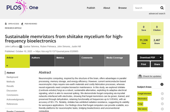 オハイオ州立大学の研究者らが、シイタケの「菌糸体」と呼ばれる部分を、コンピューター用のメモリチップとして使う研究を発表しました。将来的に、環境に優しい低コストなメモリチップの代替品となる可能性があります。