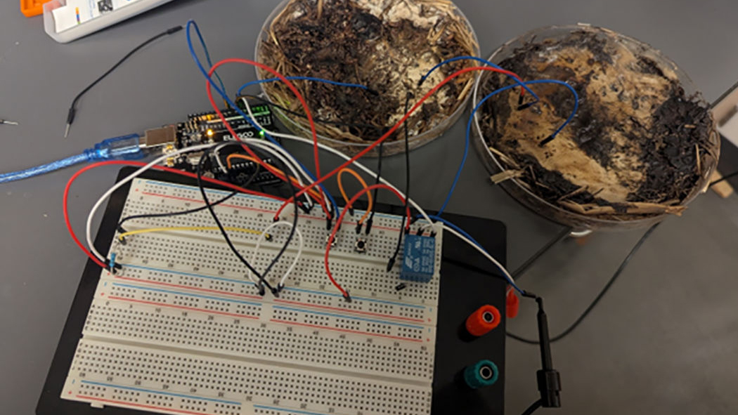 研究ではまず、シイタケの胞子からマイセリウムを培養しました。培養後、マイセリウムを乾燥させることで、安定して保管できる状態を作っています。その後、マイセリウムに金属電極を接続し、所定の波形、電圧、周波数で電気刺激を加えて、入出力電圧・電流を測定しています。