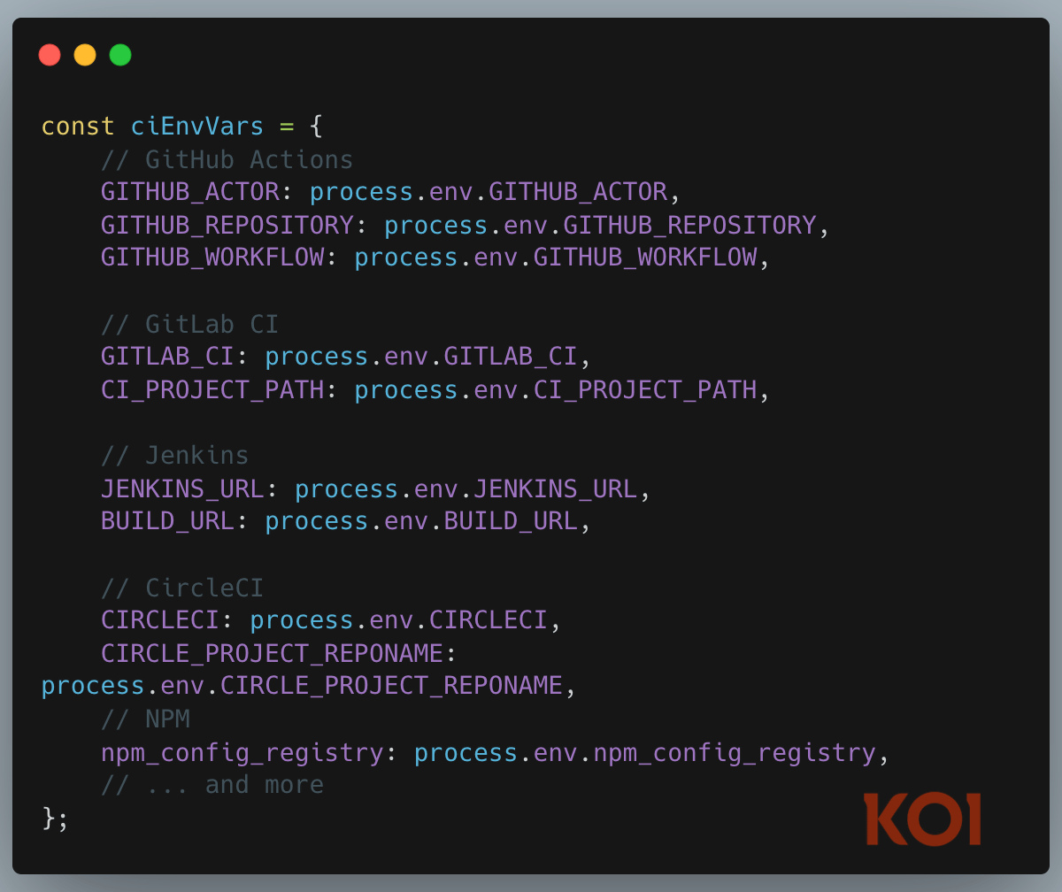 KoiはPhantomRavenの実例として「ユーザーの情報を収集するプログラム」が配信されていたことを確認しています。このプログラムは攻撃対象の開発環境をスキャンして「メールアドレス」「Github Actionsのトークン」「GitLab CIの認証情報」「Jenkinsの認証情報」といった数多くの情報を収集していました。さらに、「ホスト名」「OS」「IPアドレス」「ユーザー名」「現在のディレクトリ」「Node.jsのバージョン」といった情報を集めてフィンガープリントを作成していたことも分かっています。