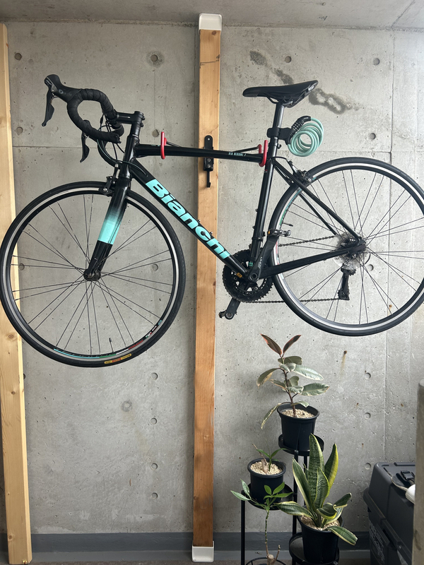 玄関のアルコーブ部分です!ここは以前、2×4材を使って自転車を吊るすスペースを作っていました。その下部にちょうどいいスペースがあるではありませんか!