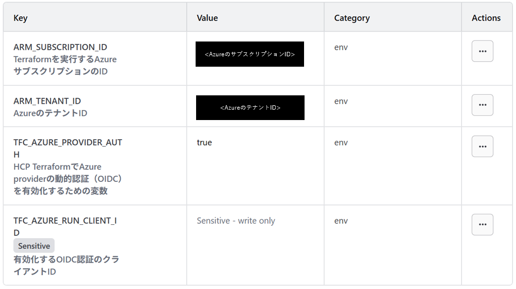 いずれも環境変数での登録となります。terraformのvariableではなく、環境変数として登録するためカテゴリに注意しましょう。