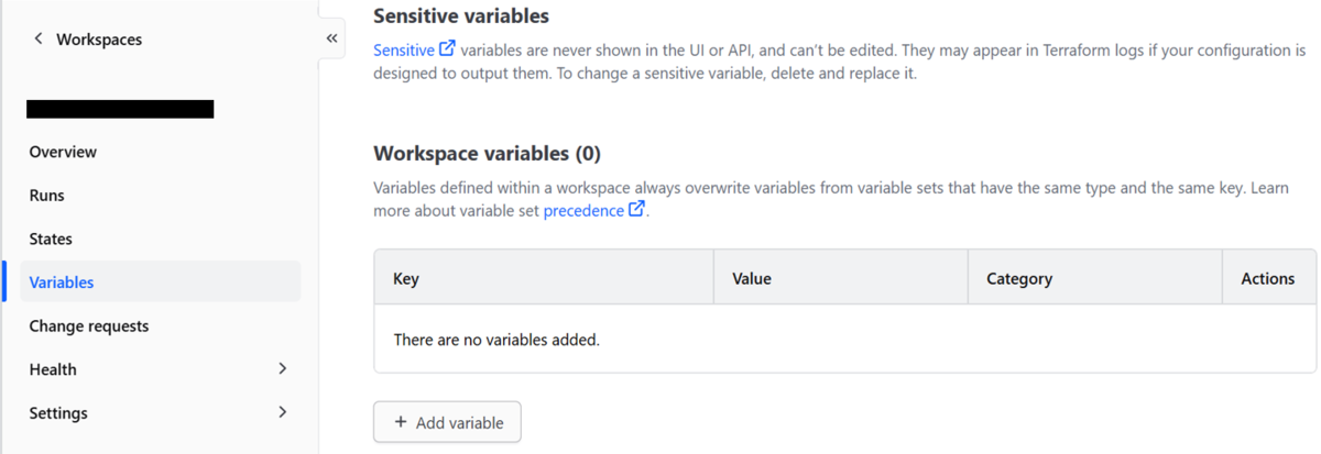 設定を行いたいHCP Terraform Workspaceに移動し、[Variables]→[+ Add variable]をクリックして、variableの作成を行います。