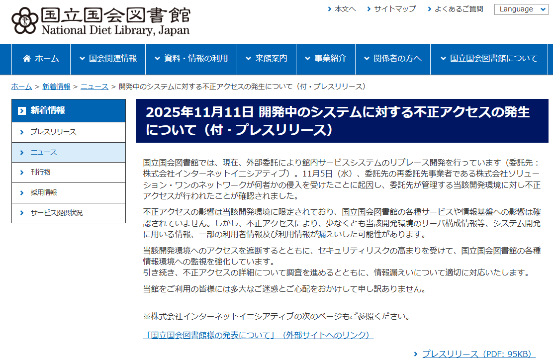 同システムの開発は国会図書館より株式会社インターネットイニシアティブ(IIJ)に委託しており、IIJより、一部の開発を株式会社ソリューション・ワンに委託していた。今回の発表は、11月5日にソリューション・ワンのネットワークに何者かが侵入したことが確認されたというもの。