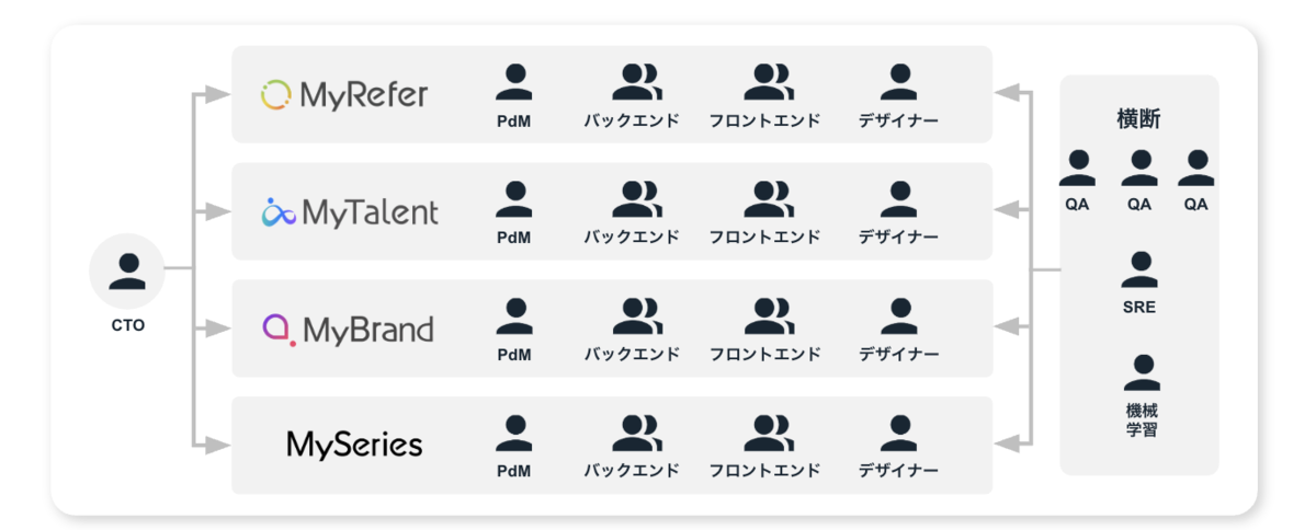 前提としてはTalentXは開発チームがプロダクトごとにMyRefer、MyTalent、MyBrand、MySeriesと4つのチームに分かれています。