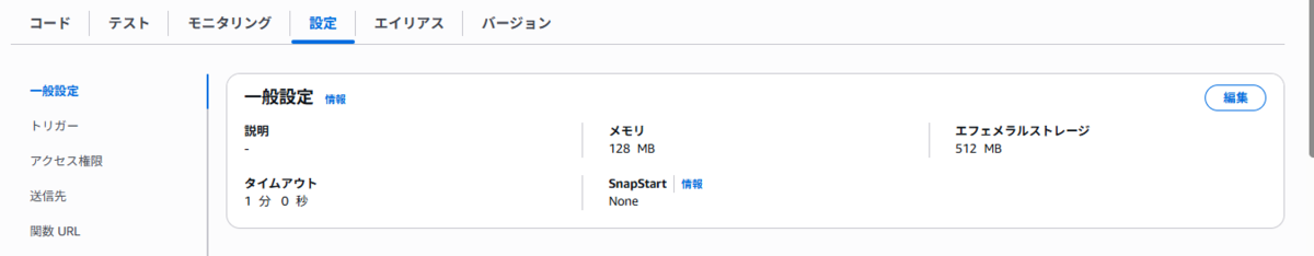 - Lambdaの一般設定で「タイムアウト」を1分程度に変更してください(ファイル操作に余裕を持たせるため)。