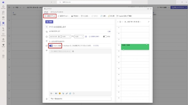 新しいイベント画面の[Teams会議]をオンにし、[会議のオプション]をクリックします。