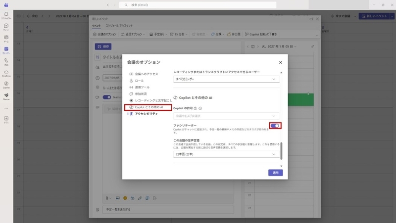 会議のオプション画面から[Copilotとその他のAI]をクリックし、[ファシリテーター]をオンにします。