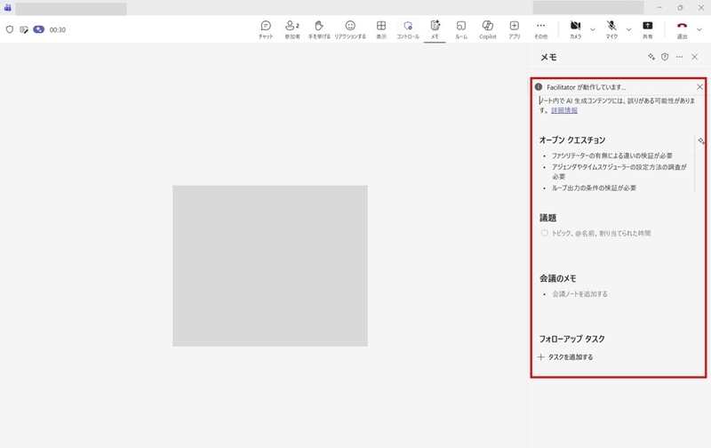 会議画面の右に「メモ」が表示され、ファシリテーターエージェントによって、リアルタイムで会議メモが作成されていることが確認できます。