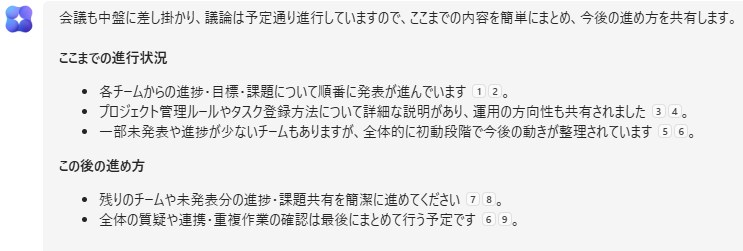 例えば、会議後に議事録を自動生成したり、チャットで必要な情報を即座に検索・提示することで、情報整理やタスク遂行をスムーズに行うことができました。