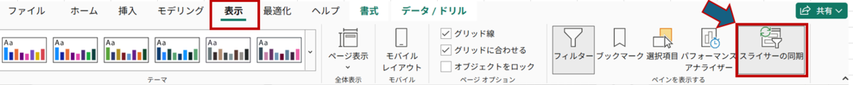- チェックボックスにて、スライサーの同期や表示・非表示を設定します。