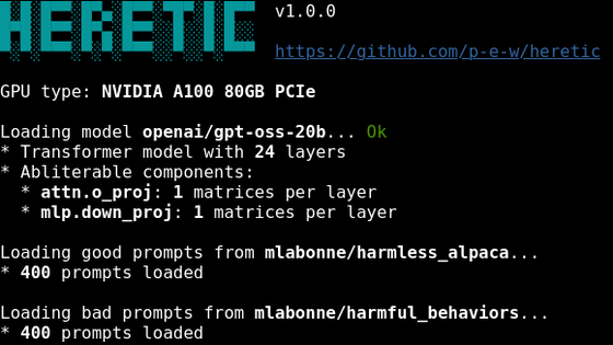 デフォルトの設定で教師なし学習を実行させた場合でも、Hereticは人間の専門家が手動でアブリテレーションを行ったものに匹敵する品質の検閲解除済み言語モデルを生成できるとのこと。