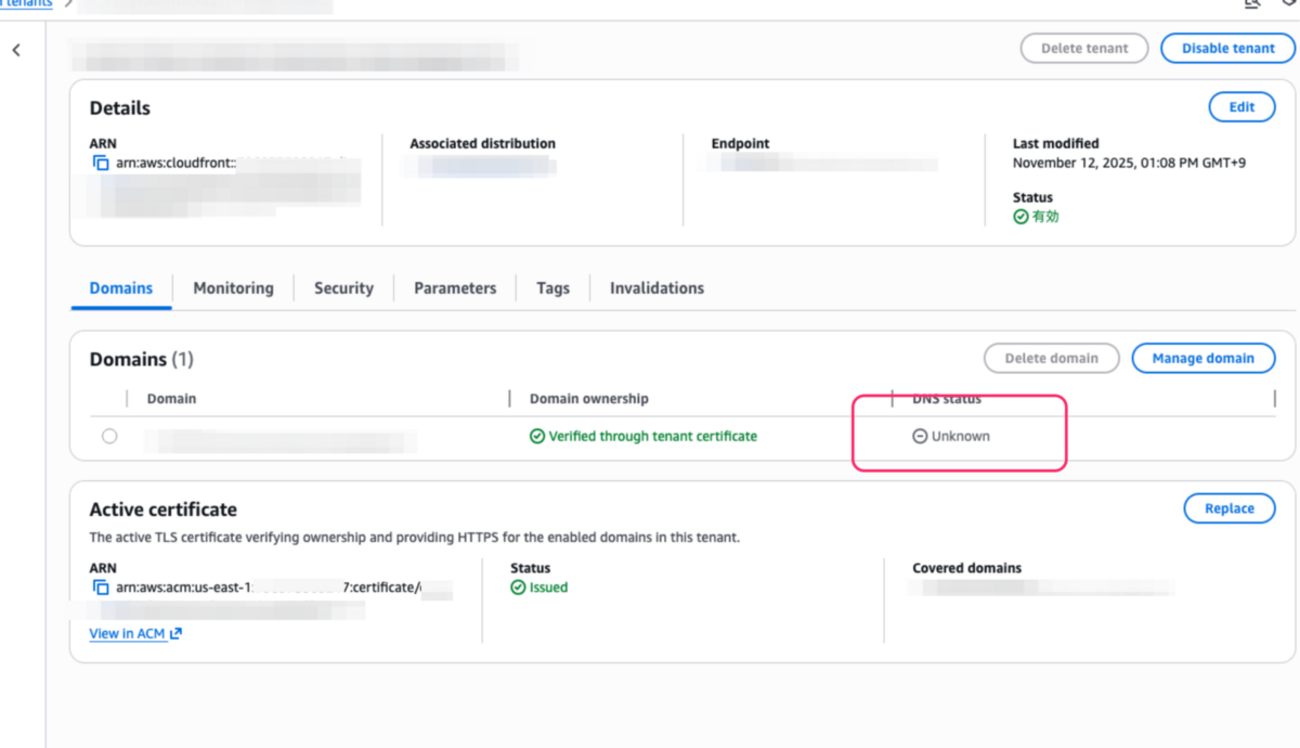 - DNS statusが”Unknown”になってしまうため、将来的にCloudFront SaaS Managerで新機能が提供された際、その機能がDNS検証ステータスに依存する場合、利用できない可能性があります