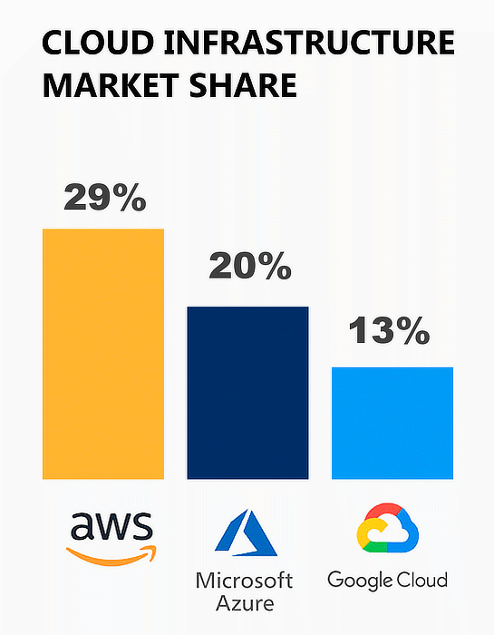 クラウドインフラのシェア、AWSが再び30%を切って29%に。Googleが13%へと成長。2025年第3四半期、Synergy Researchの調査結果