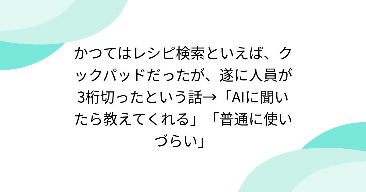 かつてはレシピ検索といえば、クックパッドだったが、遂に人員が3桁切ったという話→「AIに聞いたら教えてくれる」「普通に使いづらい」