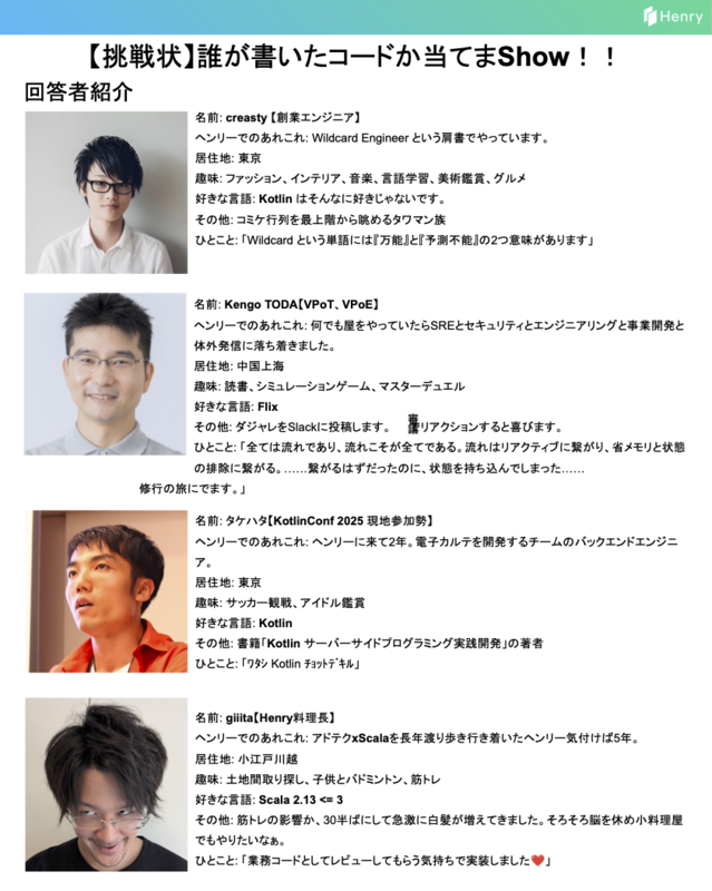 そのクイズは「【挑戦状】誰が書いたコードか当てまShow!!」と題し、ヘンリーのエンジニア4人が同じ問題に対してコードを書き、どのコードを誰が書いたか当ててもらうというもので、非常に盛り上がり楽しんでいただくことができました。