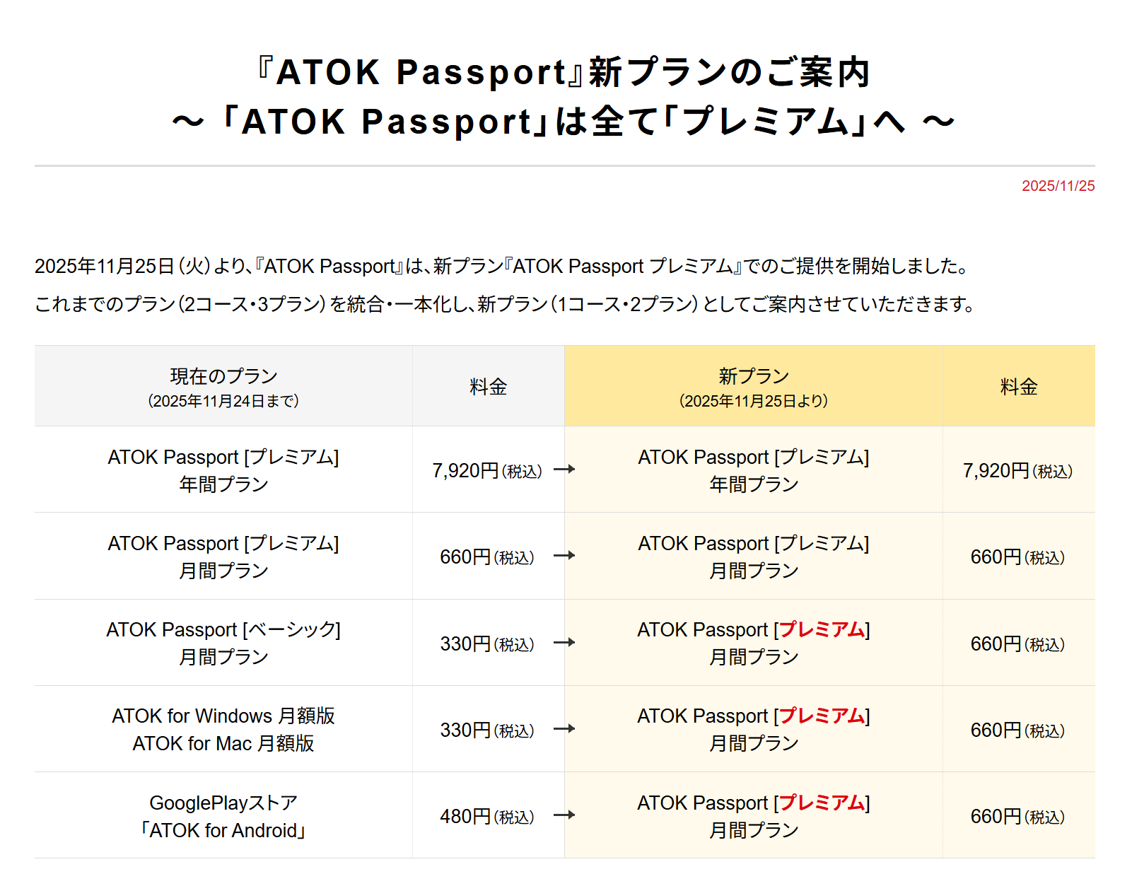 ジャストシステムは11月25日、日本語入力システム「ATOK」のサブスクリプションサービス「ATOK Passport」の料金プランを改定した。月額330円の「ベーシック」を廃止し、月額660円(または年額7920円)の「プレミアム」に一本化する。理由は明らかにしていない。 ベーシックのユーザーからは「プレミアムの機能が不要で…
