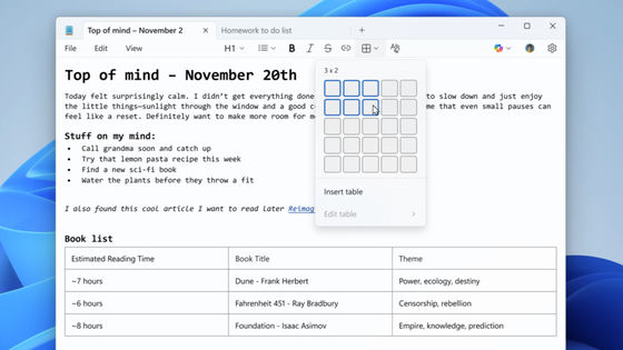 ひとつは、メモ帳の軽量書式設定機能が拡張され、表がサポートされたという点。表を挿入するには書式設定ツールバーに追加される「表」オプションを使用するか、Markdown構文を使って直接表を追加すればOK。表を挿入した後は、右クリックのコンテキストメニューやツールバーの「表」メニューから、行や列の追加・削除といった簡単な編集が行えます。