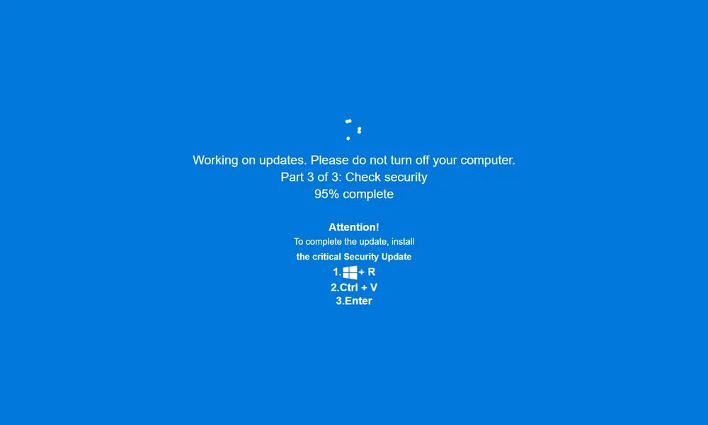 この攻撃は、偽のアダルトサイトを中心に展開されている、「JackFix」と呼ばれるもの。ユーザーがサイトをクリックすると、ブラウザが全画面表示になり、偽のWindows Update画面が表示される。画面には進捗状況のアニメーションなどが表示され、ユーザーに対し所定のコマンドを実行するよう指示する文面が現れる。