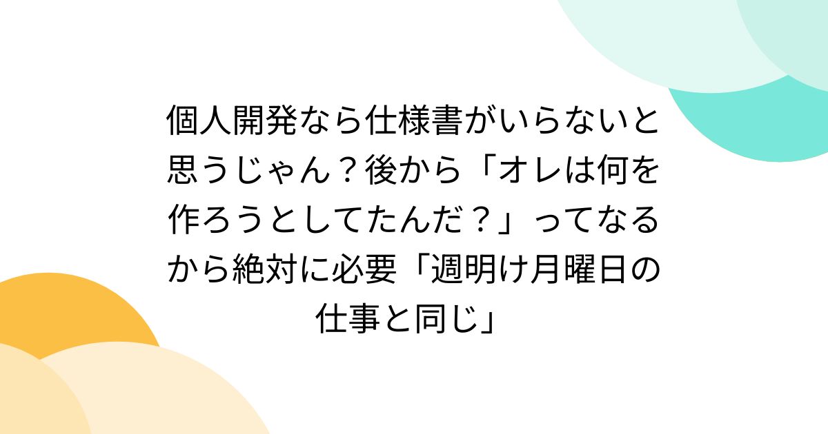 個人開発なら仕様書がいらないと思うじゃん?後から「オレは何を作ろうとしてたんだ?」ってなるから絶対に必要「週明け月曜日の仕事と同じ」