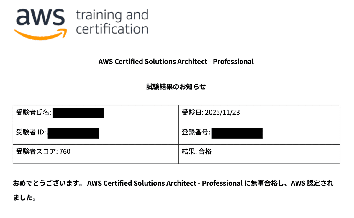 AWS CLF、AWS SAA、AWS DVAに続き、2025年11月下旬にAWS Certified Solutions Architect – Professional(SAP-C02)に合格しました。