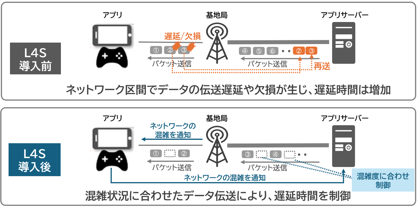 L4Sを基地局に導入することで、ネットワークの混雑状況を早期に検知して利用者のアプリに通知後、アプリからサーバーに通知する。これにより、サーバーがネットワークの混雑状況に合わせてデータ送信速度を適切に制御し、パケット滞留や欠損を回避し、途切れない通信を実現する。