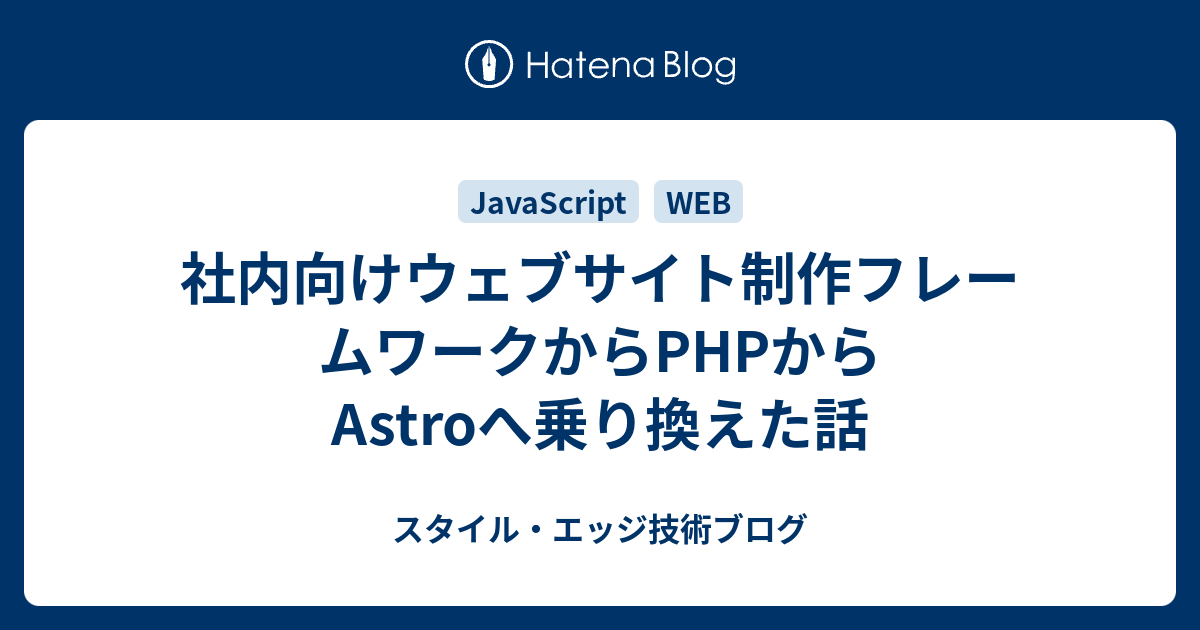 社内向けウェブサイト制作フレームワークからPHPからAstroへ乗り換えた話 | スタイル・エッジ技術ブログ 2025.11.30 企業テック 記事のタイトルとURLをコピーする <div type=”html”/> 元の記事を確認する Post Share Hatena LINE RSS feedly Pin it note 技術書典19で買った『わかる!ソフトウェア設計トレーニング』が良かった 前の記事 【エディタ】VS codeからAntigravityに移行しました #VSCode - Qiita 次の記事 関連記事 企業テック Notion AI 3.0で入社後のキャッチアップを爆速でしよう! – CloudNative Inc. BLOGs 2025.10.22 企業テック LinuxTV 向けアプリ開発者が Vega OS と向き合った話 〜フォーカス編〜 2025.11.14 企業テック EV値って何!?物理的なライト/露光設定がゲームの描画で成立する流れ | 技術ブログ – infiniteloop 2025.09.21 企業テック 今週の新着ブログ23本_JaSST’25 Niigata 講演レポート_SAFe研究考察_肩書きに依存しない生き方(2025.11.7~2025.11.13)|SHIFT Group 技術ブログ 2025.11.13