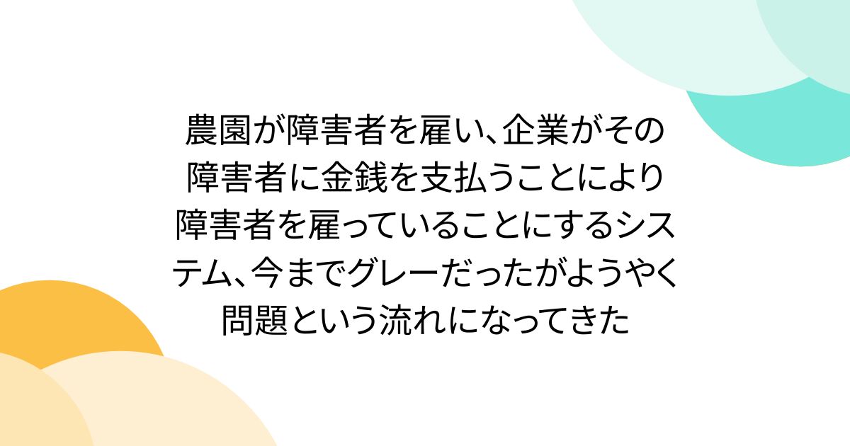 農園が障害者を雇い、企業がその障害者に金銭を支払うことにより障害者を雇っていることにするシステム、今までグレーだったがようやく問題という流れになってきた