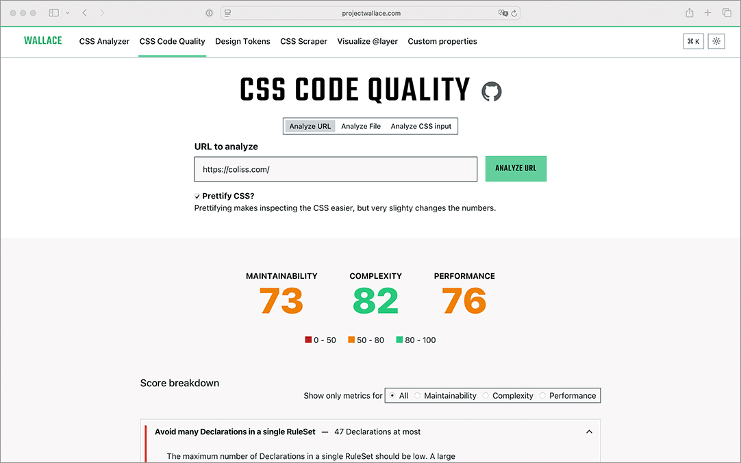 CSSは、保守性、複雑性、パフォーマンスの面から解析され、問題がある箇所はどのように改善するればよいかも教えてくれます。