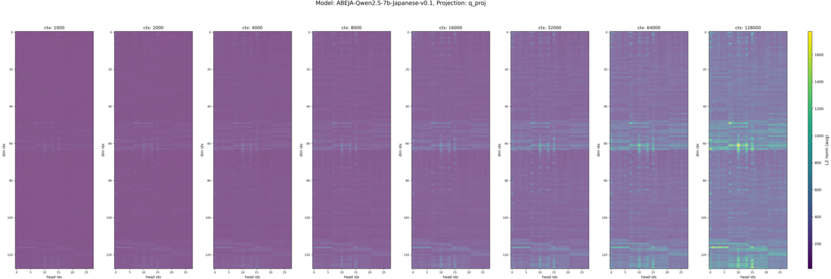 - 32k (デフォルトで扱えるコンテキスト長のギリギリ)以上では、一部、スケールの範囲を超えた値が白く表示されている。(スケールは最大値・最小値で自動調整される設定にしていたため、適切な表示になっていない可能性がある)