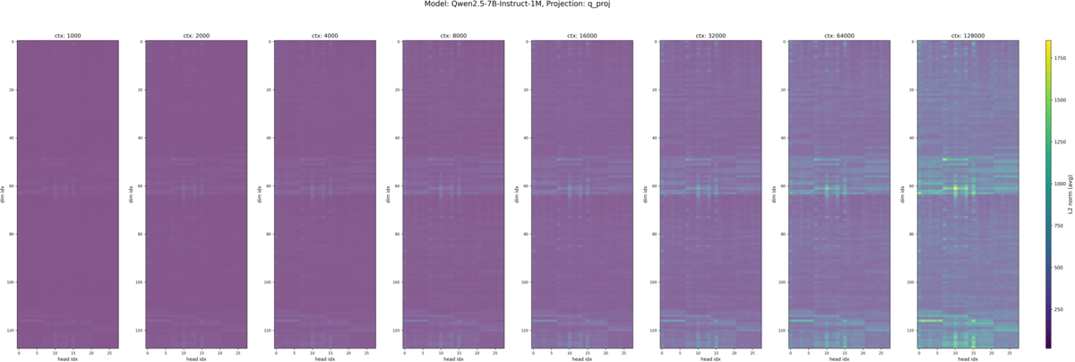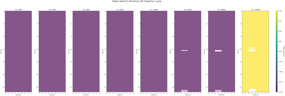 それぞれのモデルの入力トークン長別の Q, K のヒートマップが以下です。各ヒートマップの縦軸は埋め込み次元のインデックスで、一番上が 0 次元目(RoPEの高周波領域)、一番下が 128 次元目(RoPEの低周波領域)になっています。横軸は Attention ヘッドのインデックスで Qwen2.5-7B-Instruct におけるヘッド数は Q が 28 、 K が 4 となっています。*2また各画像内で横に並んでいる複数のヒートマップは、左から入力トークン長が 1k, 2k, 4k, 8k, 16k, 32k, 64k, 128k の時の結果です。