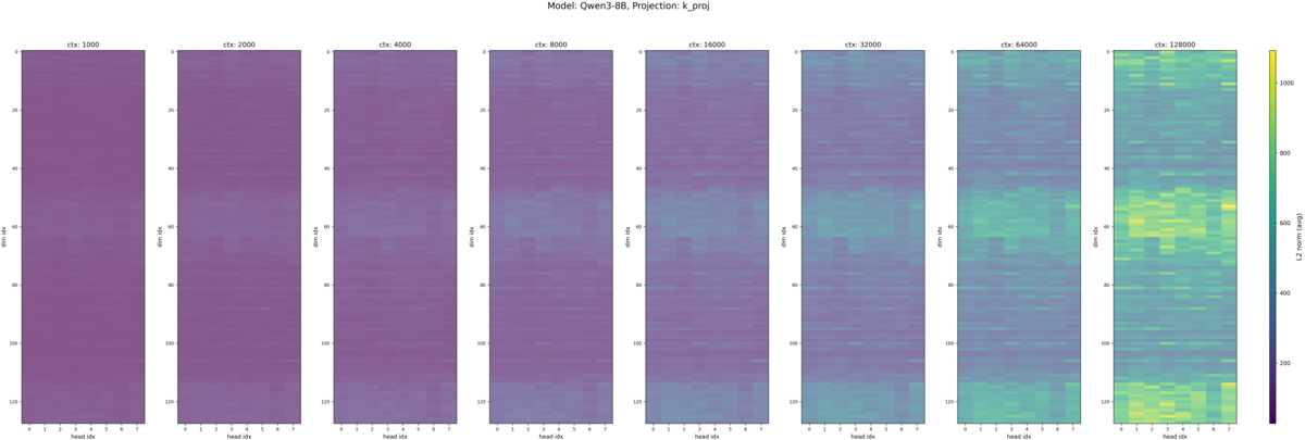 ということが見て取れるかと思います。モデル間の違いについてはほとんど見受けられません。 K のグラフでは各図のカラーバーの上下限(色スケール)を 1k〜128k で共通化している影響で値の大小関係が正確にはわかりませんが、白く値が飛んでいる領域は Q で Massive Value が現れている周波数帯と同じになっています。 Massive Value が現れる周波数帯については、先行研究と少し異なり中間の周波数帯でも Massive Value が現れており、先行研究で述べられている「RoPE を採用しているモデルでは Massive Value が低周波数領域に集中する」という仮説と少し異なる結果になりました。