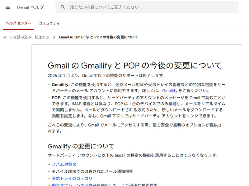 あわせて、スパム対策やメールの自動並べ替え、高度な検索といったGmailの機能を、Gmail以外のメールアカウントでも使えるようにする「Gmailify」についても、年内でサポートを終了する。