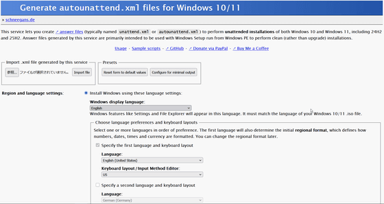 なお、クリーンインストールであれば、コマンドを入力するのではなく、インストール用のUSBドライブを正規の方法で作成した後、無人インストールを実行するための応答ファイルであるautounattend.xmlをUSBドライブ直下に置くことで、Microsoftアカウントへのサインインの回避が可能になります。autounattend.xmlは以下のサイトでカスタマイズ可能です。