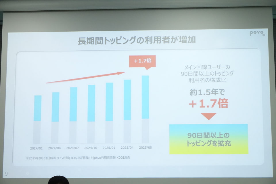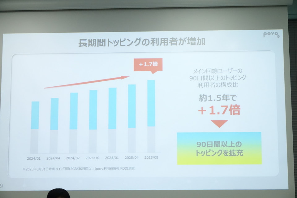 今回のトッピング拡充では、あわせて長期間トッピングも強化されている。これは90日間以上のトッピングのユーザーが約1.5年で1.7倍に増加したことを受けたもの。中山氏は、長期間のトッピングは月々のデータ利用量に多寡があっても、データを使う月・使わない月を、コントロールしやすい部分が評価されているのではないかと認識を示した。