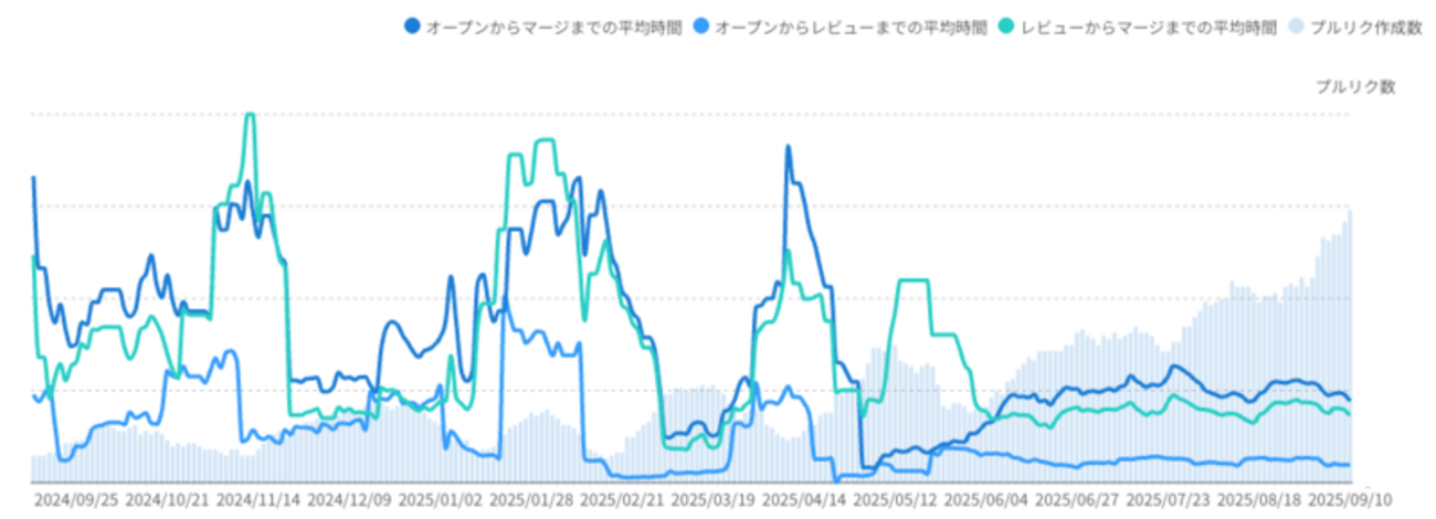 はじめに プロジェクトチームのリーダーを務める生江です。 日々の開発業務に取り組む中で、「自分たちのチームは本当に成長できているのだろうか?」「改善はしているものの、その効果は現れているのだろうか?」と疑問を感じることはありませんか?実は私も、データによる可視化を行うまではそうした漠然とした不安を抱いていました。 この記事では、私たちのチームが過去半年間、開発プロセスを改善するために行ってきた様々な取り組みと、その成果をFourKeys を用いて客観的に可視化し、皆さんと共有したいと思います。 はじめに 私たちが抱えていた課題 課題に対する取り組み 取り組みの成果 1. リードタイムの短縮とプ…