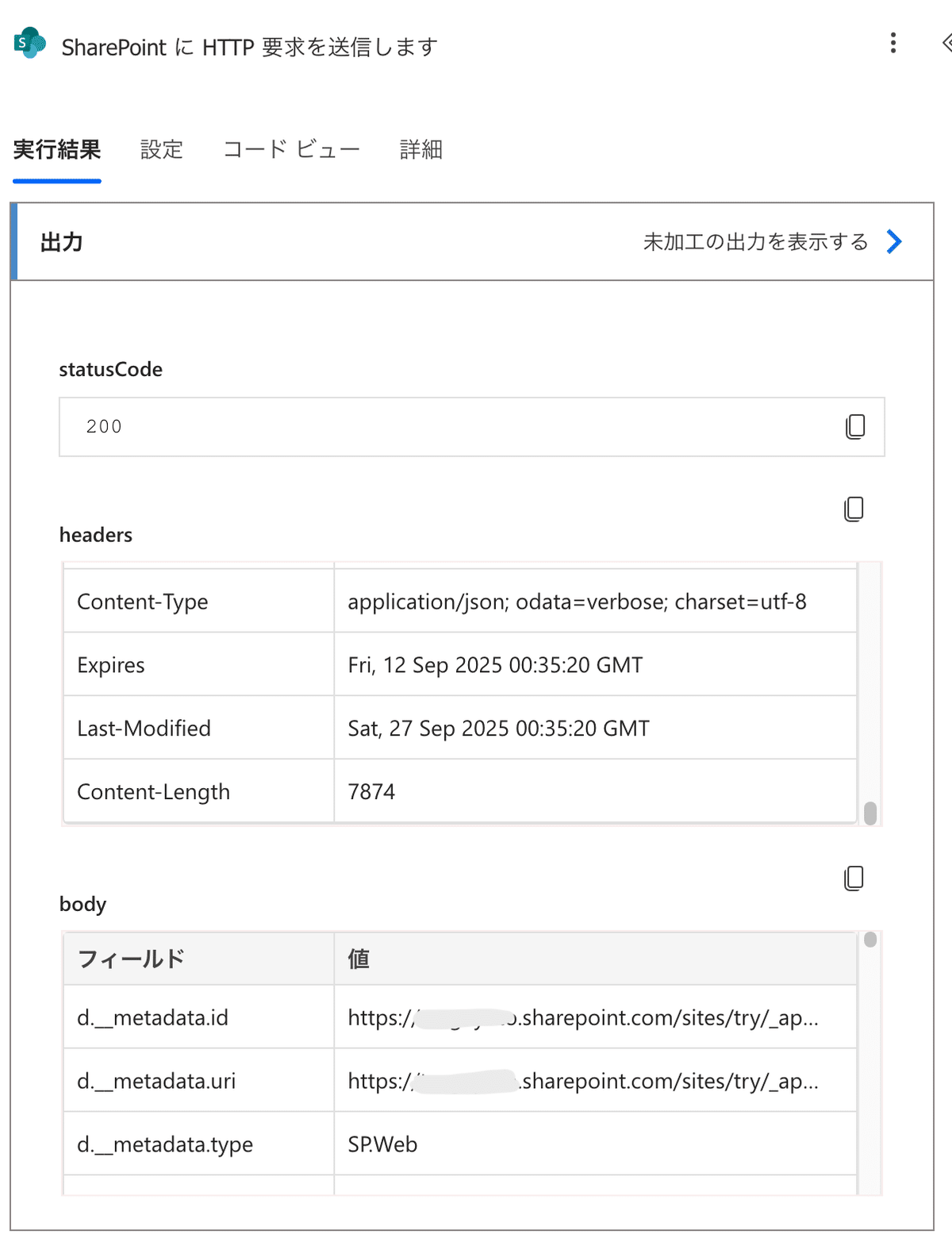 例えば、Power Automateの[SharePointにHTTP要求を送信します]アクションにおいて、_api/web(当該サイトのすべてのリソースの一覧を取得する)に向けて、GETリクエストを送信してみます。