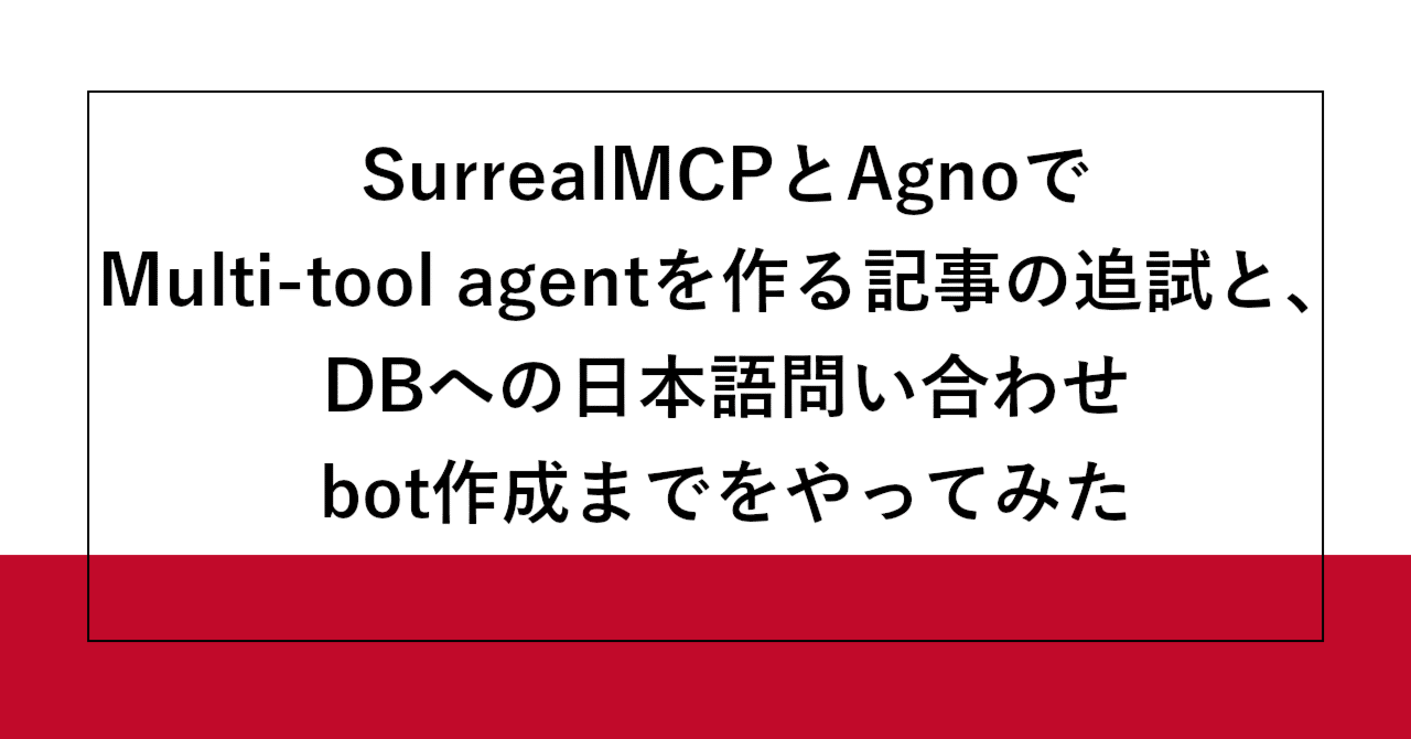 SurrealMCPとAgnoでMulti-tool agentを作る記事の追試と、DBへの日本語問い合わせbot作成までをやってみた | SHIFT Group 技術ブログ 2025.10.11 企業テック 記事のタイトルとURLをコピーする 動機続きをみる 元の記事を確認する Post Share Hatena LINE RSS feedly Pin it note Qualcomm、Armとの訴訟に全面勝利 - ケータイ Watch 前の記事 Microsoftが「給与振込口座がいつの間にか見知らぬ口座にすり替えられる」給与海賊(ペイロールパイレーツ)というサイバー攻撃について警告 次の記事 関連記事 企業テック 【SWTTokyo25レポ】 クエリパフォーマンスチューニングの傾向と対策 | ちゅらデータ株式会社のフィード 2025.09.14 企業テック 一つのことから多く学ぶ技術 – Yappli Tech Blog 2025.09.28 企業テック First time experience at DroidKaigi 2025 | by David Santos | Pairs Engineering | Sep, 2025 2025.09.20 企業テック Portainerはいいぞ!~WebアプリでDocker管理~ | ヘッドウォータースのフィード 2025.10.02