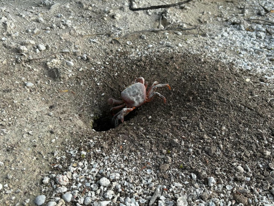 道にはカニがたくさんいます。カメラを向けるとすぐに穴に隠れてしまいます。