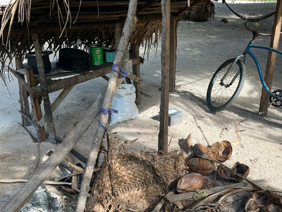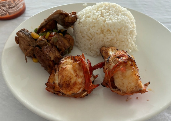 本日の昼食は、お米とロブスターとお肉。ロブスターは島の近くで獲れる貴重な食糧源だそうです。