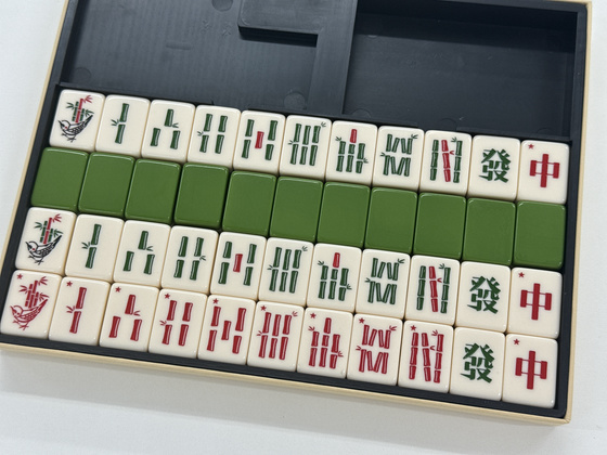 牌は背が緑色の練り牌で、策子・發・中が4枚ずつで全部で44枚。策子は4枚のうち1枚だけが赤牌になっています。