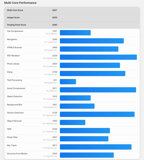 マルチコアのベンチマーク結果詳細はこんな感じ。マルチコアのスコア2027も、廉価版スマートフォンと同等程度のスコアです。